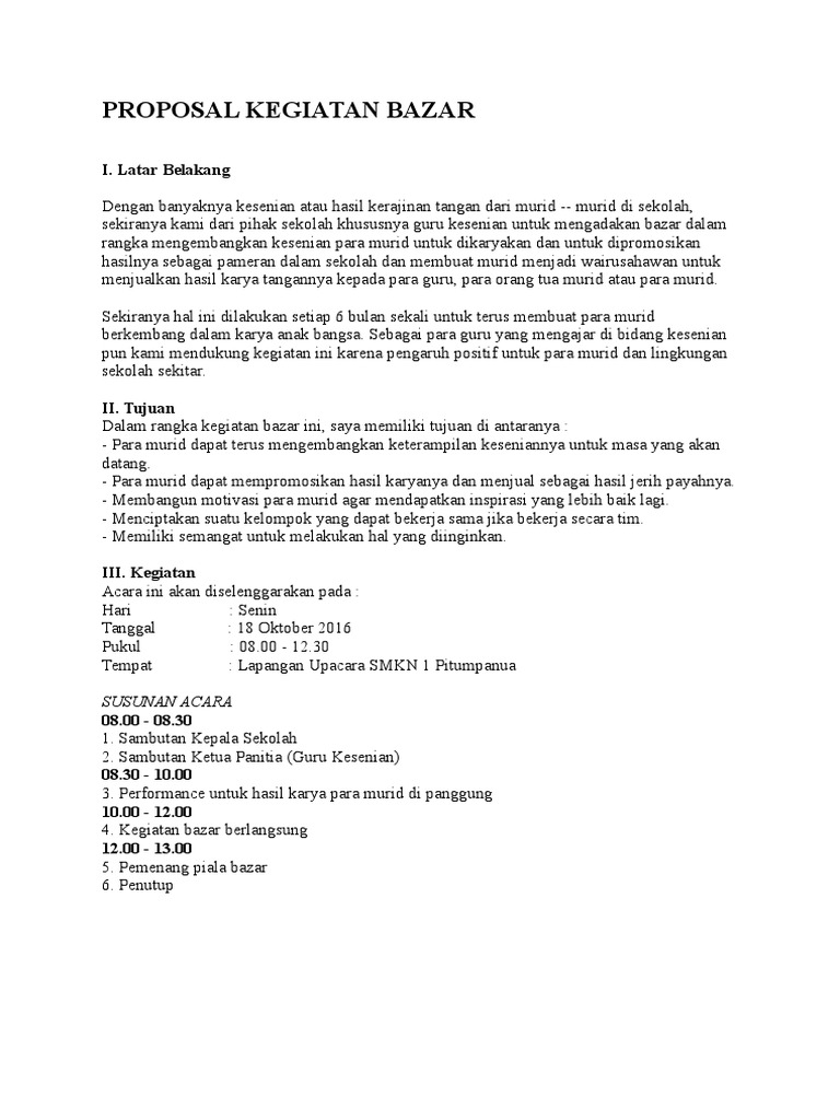 Download contoh proposal bazar kali ini saya akan membahas suatu proposal mengenai proposal kegiatan bazar. Untuk itu kami sangat mengharap kepada bapak/ ibu muzaki untuk sudi membantu agar terwujudnya kegiatan tersebut. Dengan banyaknya kesenian atau hasil kerajinan tangan dari murid — murid di sekolah, sekiranya kami dari pihak sekolah. Proposal merupakan sejenis susunan acara kegiatan yang. Doc contoh pembuatan proposal sisca indriani academia edu.